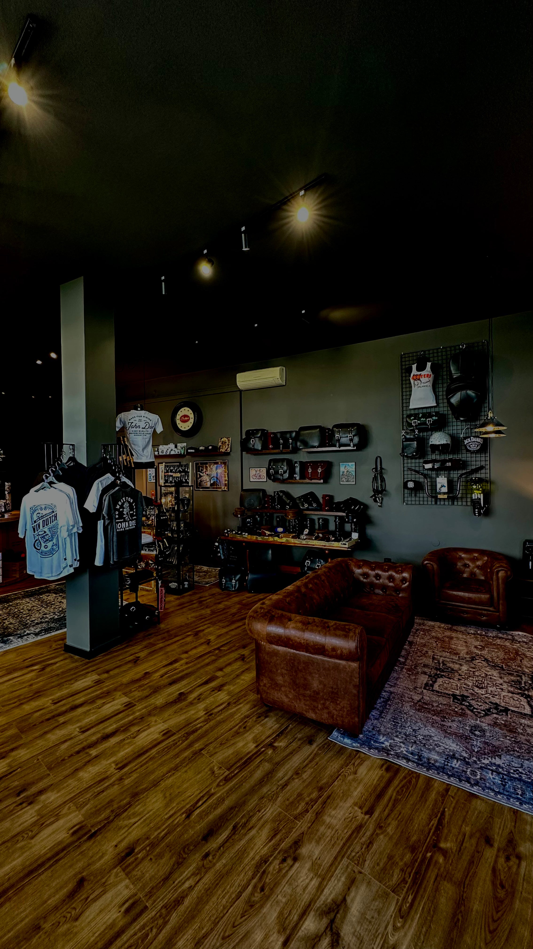 Immerse yourself in our lounge, where you can relax surrounded by handcrafted paintings and clocks, unique motorcycle portraits, and the authentic energy of road style that pervades every corner of our store.